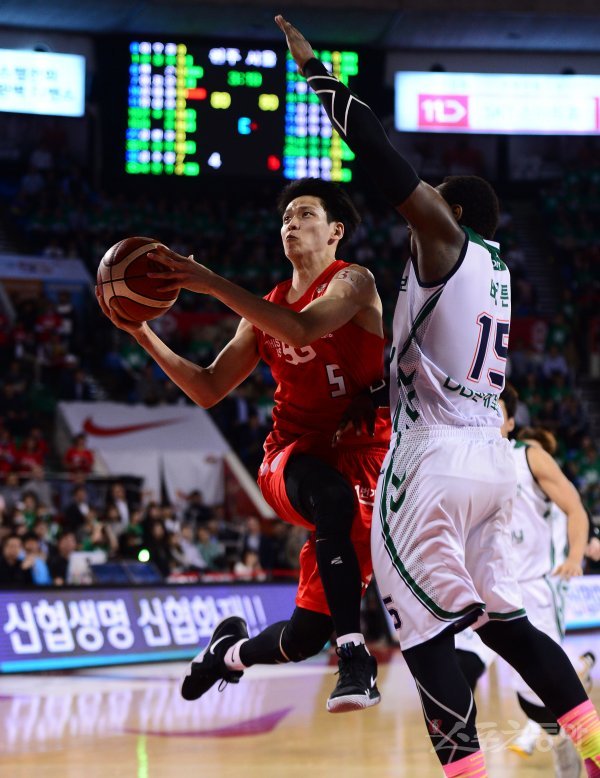 12일 서울 잠실학생체육관에서 열린 ‘2017-2018 정관장 프로농구’ 서울 SK와 원주 DB의 챔피언결정전 3차전 경기에서 SK 김선형이 DB 버튼의 수비를 피해 슛을 쏘고 있다.
