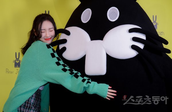 가수 선미가 13일 서울 중구 명동 눈스퀘어에서 열린 영국 스타일리시 캐릭터 브랜드의 매장 오픈 기념 행사에 참석해 캐릭터와 함께 포즈를 취하고 있다.
