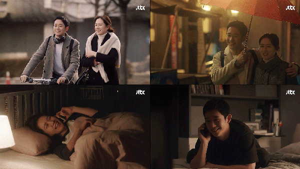 지난 2회에서 함께 술을 마시러 간 진아와 준희. 갑자기 내린 비에 우산을 사러간 준희는 잠시 망설임 끝에 빨간 우산을 하나만 샀다. 함께 우산을 쓰고 가다가 “이걸로 가다간 둘이 다 반은 다 젖겠다”는 진아의 말에 준희는 “그렇다면 방법이 있지”라며 진아의 어깨를 감쌌다. 묘한 분위기가 두 사람을 감싸는 가운데, 카를라 브루니의 ‘Stand By Your Man’이 흘러나왔다. 촉촉한 봄비 아래에서 함께 우산을 쓰고 걸어가는 두 사람은 티격태격 장난도 치고 밝게 웃기도 했지만 가까워진 거리만큼 서로를 향한 감정도 더욱 가까워지는 순간이었다.