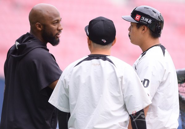 13일 서울 잠실야구장에서 ‘2018 신한은행 MY CAR KBO리그’ kt위즈와 LG트윈스 경기가 열린다. 경기를 앞두고 kt 강백호가 로하스(왼쪽)와 대화를 나누고 있다.