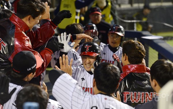 13일 서울 잠실야구장에서 ‘2018 신한은행 MY CAR KBO리그’ kt위즈와 LG트윈스 경기가 열렸다. 5회말 1사 2,3루에서 LG 양석환이 kt 선발 피어밴드를 상대로 역전 스리런 홈런을 친 후 더그아웃에서 동료들의 축하를 받고 있다.