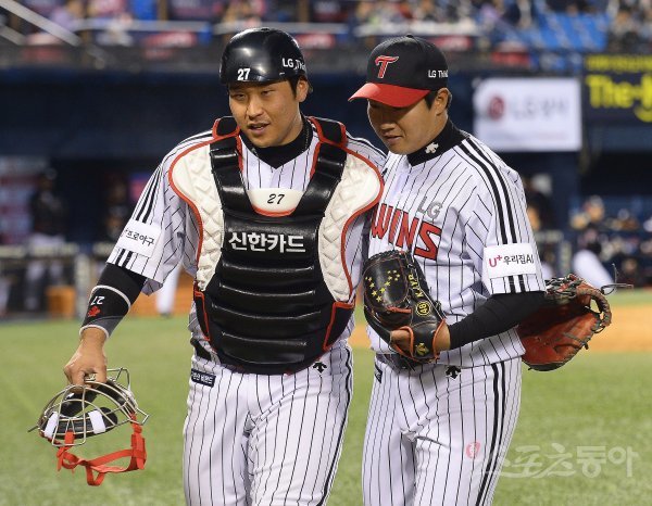 13일 서울 잠실야구장에서 ‘2018 신한은행 MY CAR KBO리그’ kt위즈와 LG트윈스 경기가 열렸다. 8회초 이닝을 무실점으로 막은 LG 포수 유강남과 김지용(오른쪽)이 더그아웃으로 들어가며 기쁨을 나누고 있다.