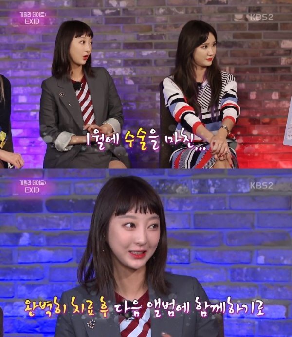 이날 EXID 혜린은 솔지의 건강을 묻는 질문에 “올해 1월에 언니가 수술을 받았다. 다음 앨범에는 참여할 수 있을 것 같다”고 말했다.
