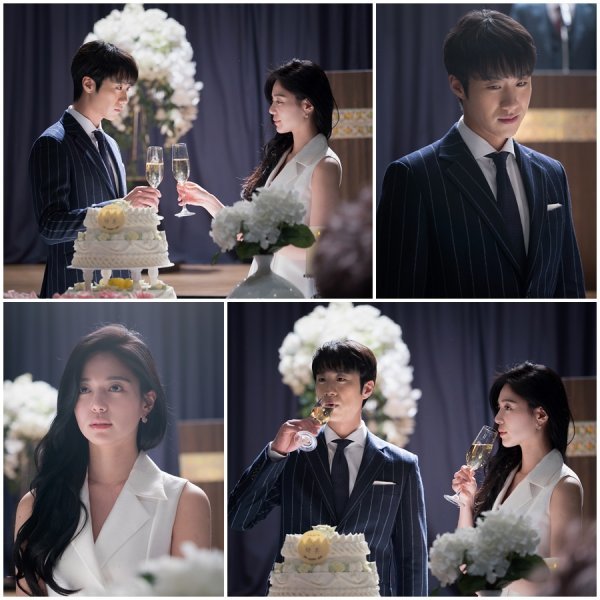 이와 관련해 ‘천국의 문’ 복지원 아이 출신 ‘뽀빠이’ 주하민과 송하그룹의 공주 백아현이 럭셔리한 약혼식을 거행하는 현장이 공개돼 시선을 자극하고 있다. 무엇보다 ‘천국의 문’ 사건과 관련해 전략적 동지 관계를 유지해온 두 사람이 평소 ‘집착’과 ‘경멸’로 얽혀 있던 사이라는 점에서, 애증을 간직한 두 남녀의 평온한 약혼식 현장이 더욱 충격을 안기고 있는 것. 우아한 턱시도와 드레스 차림을 한 채 의미심장한 눈빛으로 샴페인 잔을 부딪치고 있는 두 사람의 모습이 펼쳐지면서, 주검사-송하그룹의 ‘전략적 합병’의 전모에 더욱 시선이 쏠리고 있다.