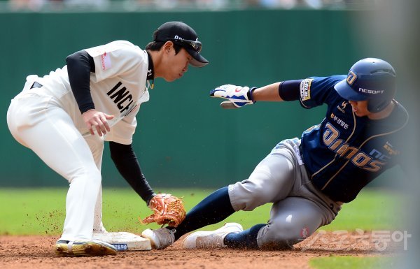 15일 인천 SK행복드림구장에서 ‘2018 신한은행 마이카 KBO리그’ SK 와이번스와 NC 다이노스의 경기가 열렸다. 2회초 무사 1루에서 NC 노진혁 타석 때 1루 주자 모창민이 2루에서 SK 박승욱에게 태그 아웃되고 있다.