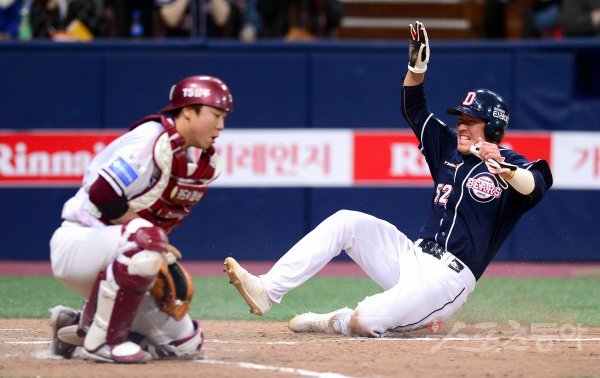 15일 서울 고척스카이돔에서 ‘2018 신한은행 MY CAR KBO리그’ 두산베어스와 넥센히어로즈 경기가 열렸다. 7회초 2사 2루 두산 최주환 중전 안타 때 2루주자 김재호가 홈까지 달려 세이프 되고 있다.