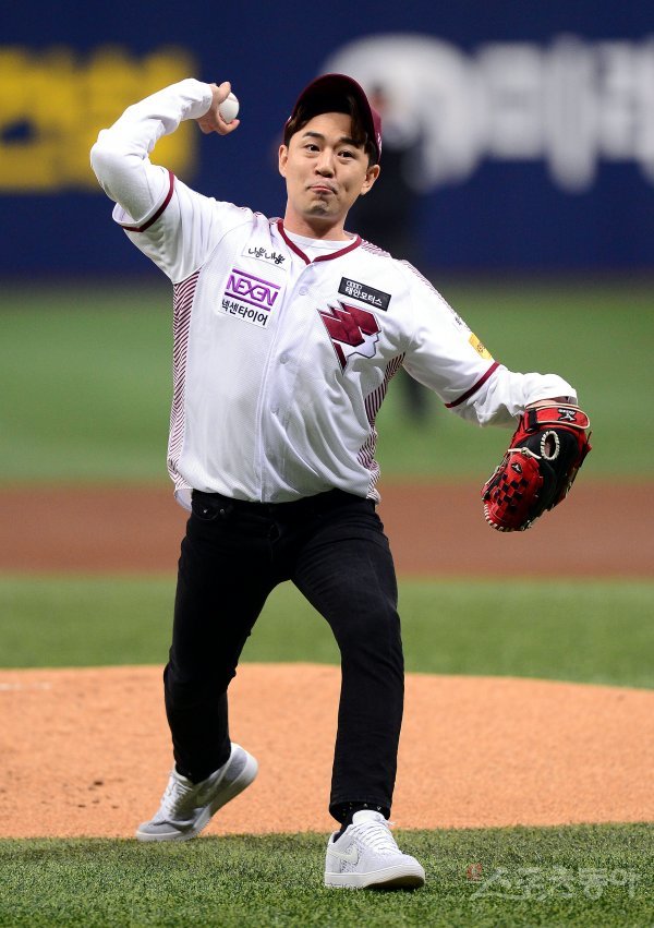 15일 서울 고척스카이돔에서 ‘2018 신한은행 MY CAR KBO리그’ 두산베어스와 넥센히어로즈 경기가 열렸다. 경기 전 방송인 붐이 시구를 하고 있다.