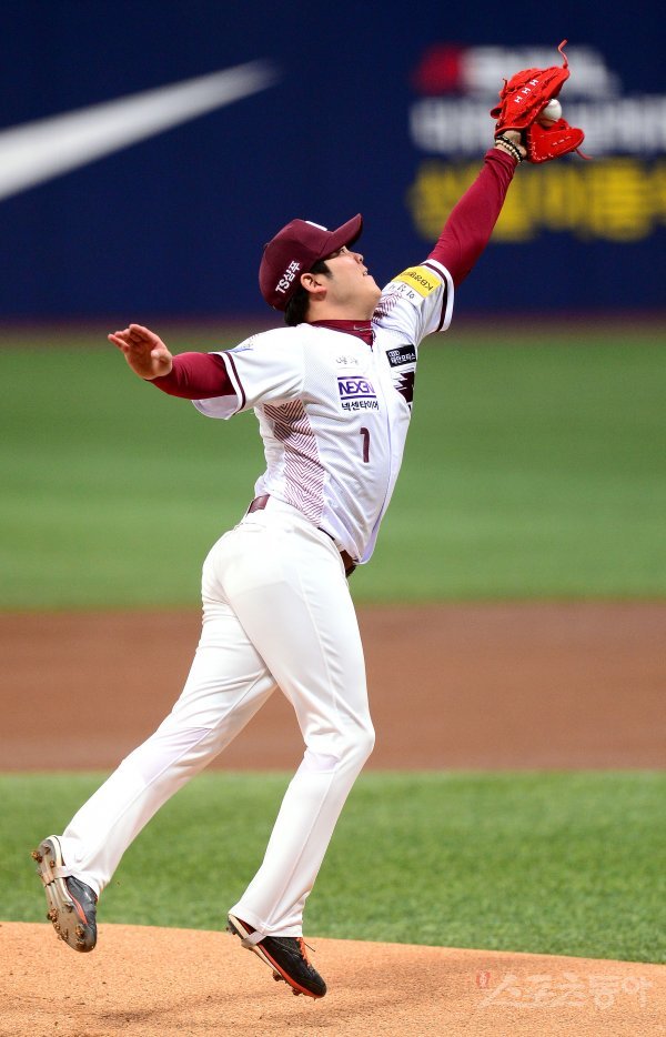 15일 서울 고척스카이돔에서 ‘2018 신한은행 MY CAR KBO리그’ 두산베어스와 넥센히어로즈 경기가 열렸다. 선발 투수로 등판한 넥센 한현희가 1회초 무사 두산 정진호의 타구를 잡고 있다.