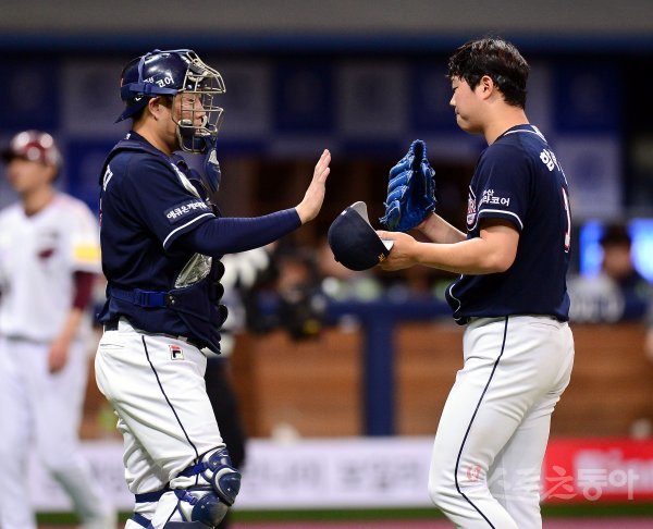15일 서울 고척스카이돔에서 ‘2018 신한은행 MY CAR KBO리그’ 두산베어스와 넥센히어로즈 경기가 열렸다. 9회말 교체 등판해 1이닝을 무실점으로 막으며 3-2 승리를 지킨 두산 함덕주가 양의지와 하이파이브 하고 있다.