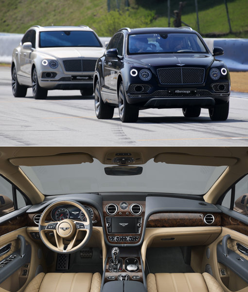 초호화 SUV 시장의 선두주자인 벤틀리 ‘벤테이가’가 용인 에버랜드 스피드웨이를 역주하고 있다. 제로백 4.1초, 최고속도는 301km로 세계 최고 수준의 퍼포먼스를 자랑한다. 벤테이가의 인테리어(아래쪽)는 수작업으로 제작되며, 우드와 가죽 소재까지 맞춤 주문이 가능하다. 사진제공|벤틀리