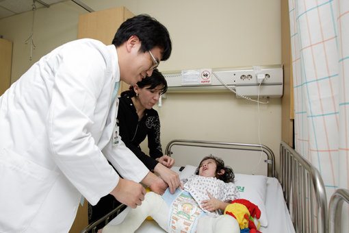 이대목동병원이 한국으로 초청해 무료 수술을 진행한 우즈베키스탄 타슈켄트 어린이 딜도라의 수술 상태를 정형외과 이승열 교수가 점검하고 있다. 사진제공|이대목동병원