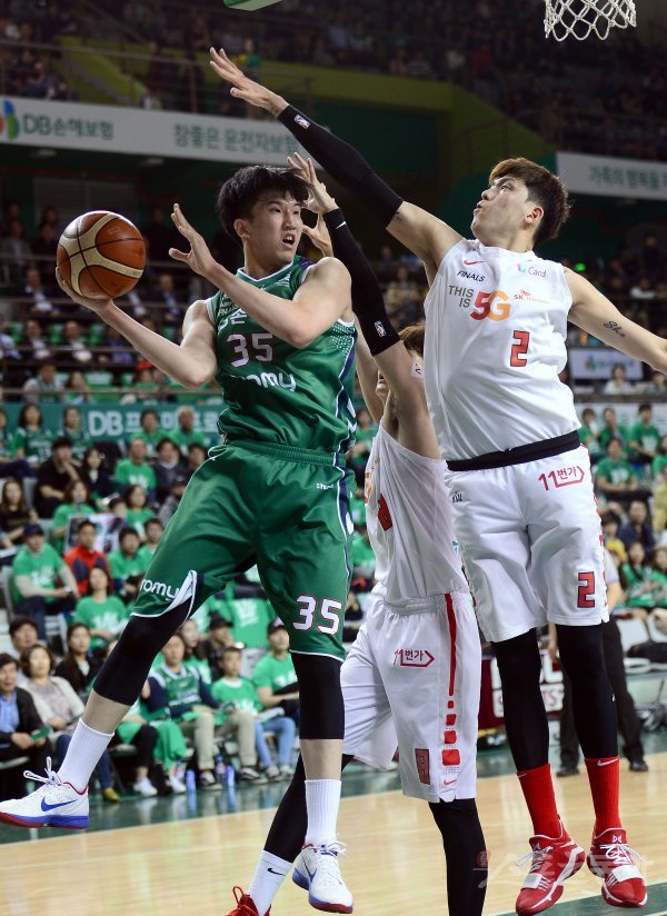 16일 원주종합체육관에서 열린 ‘2017-2018 정관장 프로농구’ 챔피언결정전 5차전 서울SK와 원주DB 경기에서 DB 서민수가 SK 최준용의 수비를 피해 골밑 패스를 하고 있다.