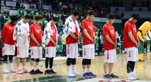 16일 원주종합체육관에서 열린 ‘2017-2018 정관장 프로농구’ 챔피언결정전 5차전 서울SK와 원주DB 경기에서 세월호 참사 4주기를 맞아 선수단이 묵념을 하고 있다.