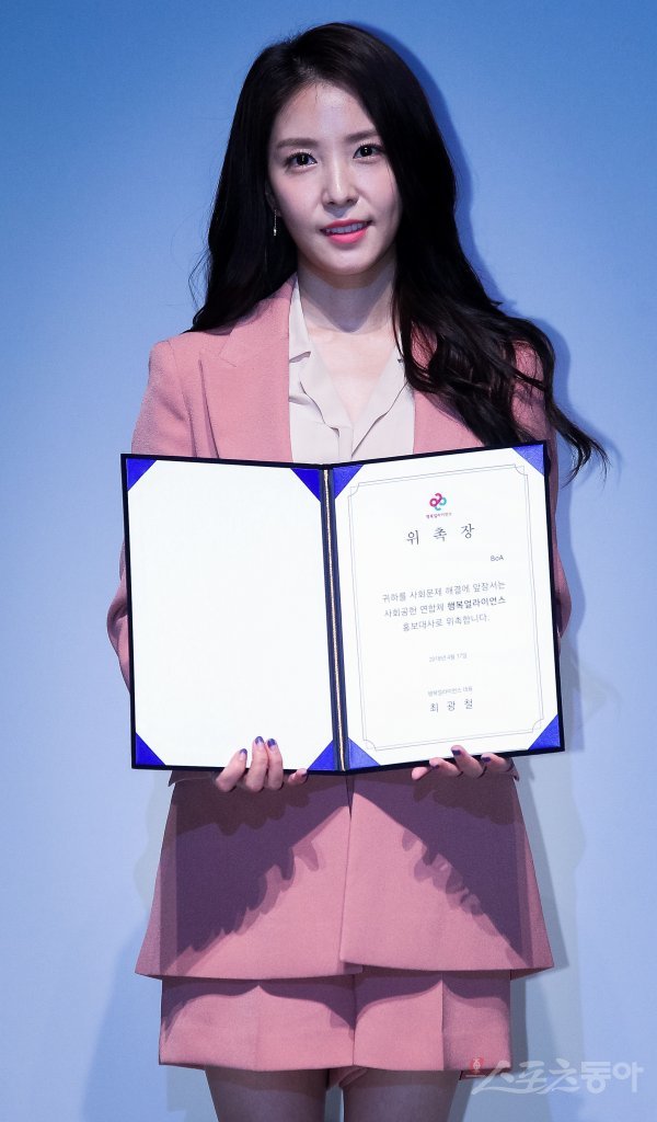 가수 보아가 17일 서울 강남구 삼성동 SM타운 코엑스 아티움에서 열린 ‘2018 행복얼라이언스 협약식 및 홍보대사 위촉식’에 참석해 위촉장을 들고 포즈를 취하고 있다.