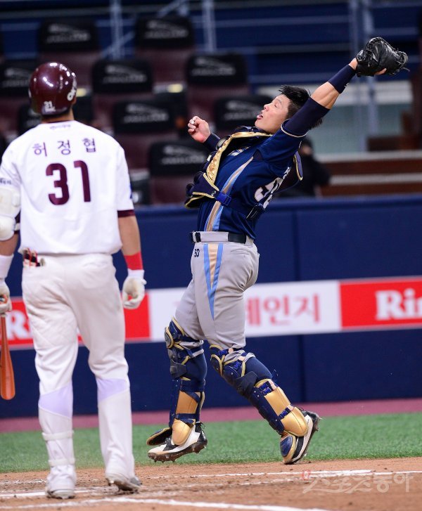 17일 서울 고척스카이돔에서 ‘2018 신한은행 MY CAR KBO리그’ NC다이노스와 넥센히어로즈 경기가 열렸다. 3회말 1사 NC 정범모가 넥센 이정협의 파울볼을 잡고 있다.