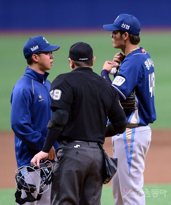 17일 서울 고척스카이돔에서 ‘2018 신한은행 MY CAR KBO리그’ NC다이노스와 넥센히어로즈 경기가 열렸다. 선발 투수로 등판한 NC 왕웨이중이 넥센 장정석 감독의 어필로 목걸이를 유니폼 안으로 넣고 있다.