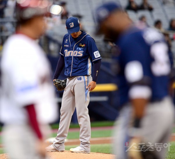 17일 서울 고척스카이돔에서 ‘2018 신한은행 MY CAR KBO리그’ NC다이노스와 넥센히어로즈 경기가 열렸다. 선발 투수로 등판한 NC 왕웨이중이 5회말 2사 2,3루 넥센 초이스에게 2타점 적시타를 허용한 후 고개를 떨구고 있다.