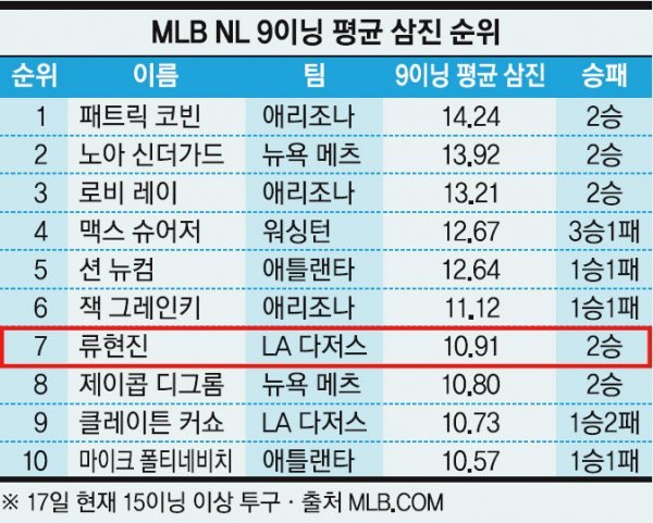 지난시즌 순위와 비교하면 뉴욕 양키스 에이스 루이스 세레비노(10.71개)를 뛰어넘는 메이저리그 전체 6위에 해당하는 삼진 기록이다. 세레비노는 지난해 메이저리그 전체에서 패스트볼 평균 구속 2위(157㎞)를 차지한 불같은 강속구를 자랑하는 투수다.