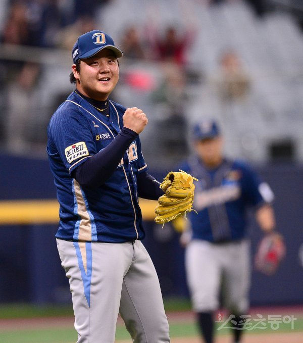 17일 서울 고척스카이돔에서 ‘2018 신한은행 MY CAR KBO리그’ NC다이노스와 넥센히어로즈 경기가 열렸다. 연장 11회까지 가는 접전 끝에 3-2 역전승을 거둔 후 NC 이민호가 기뻐하고 있다.