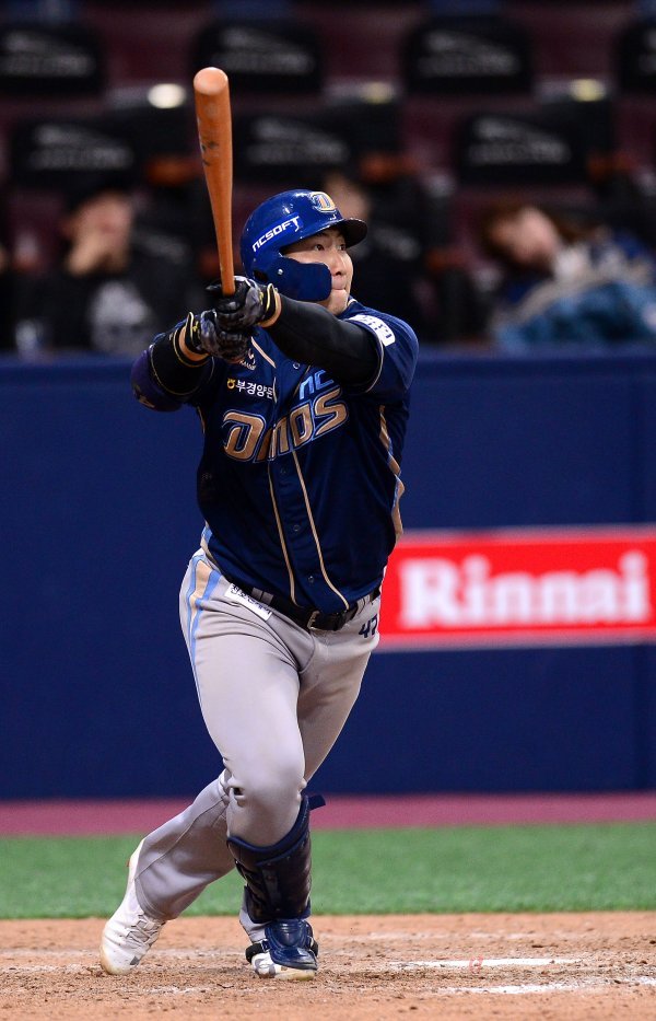 17일 서울 고척스카이돔에서 ‘2018 신한은행 MY CAR KBO리그’ NC다이노스와 넥센히어로즈 경기가 열렸다. 연장 11회초 1사 NC 나성범이 중월 솔로 홈런을 날리고 있다.
