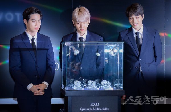 인기 K팝 그룹 엑소(EXO) 수호, 백현, 카이(왼쪽부터)가 18일 서울 강남구 삼성동 코엑스 SM아티움에서 열린 K팝 스타메달 1호 ‘엑소 공식 기념 메달’ 공개 기자회견에서 전시 된 기념화폐를 보고 미소를 짓고 있다.