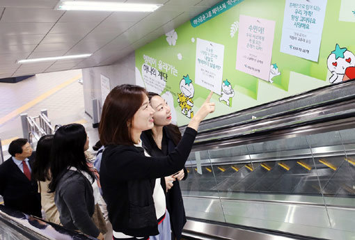 18일 서울 을지로입구역을 이용하는 시민들이 벽면에 채워진 ‘행복메시지’를 읽고 있다.