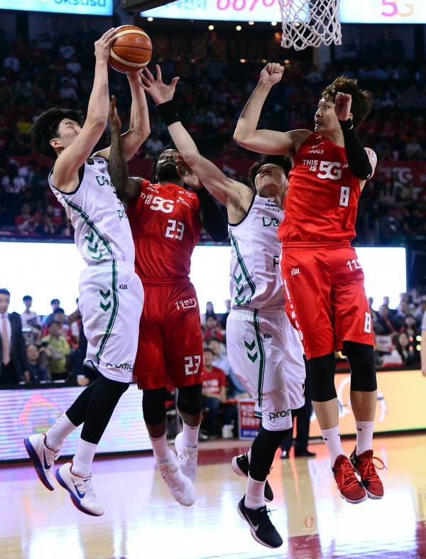 18일 서울 잠실학생체육관에서 열린 ‘2017-2018 정관장 프로농구’ 서울 SK와 원주 DB의 챔피언결정전 6차전 경기에서 DB 서민수와 SK 화이트가 리바운드를 다투고 있다.