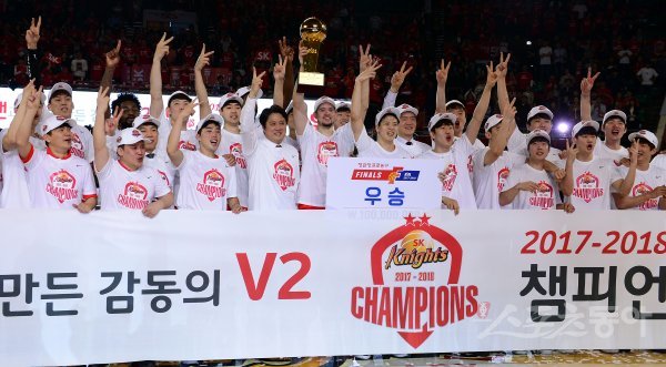 18일 서울 잠실학생체육관에서 열린 ‘2017-2018 정관장 프로농구’ 서울 SK와 원주 DB의 챔피언결정전 6차전 경기에서 SK가 우승을 차지한 뒤 선수들이 환호하고 있다.