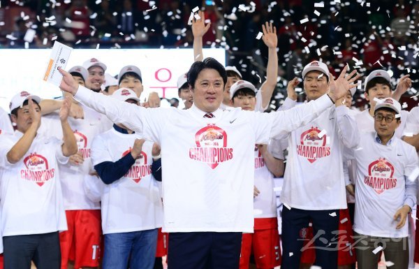 18일 서울 잠실학생체육관에서 열린 ‘2017-2018 정관장 프로농구’ 서울 SK와 원주 DB의 챔피언결정전 6차전 경기에서 SK가 우승을 차지한 문경은 감독이 환호하고 있다.