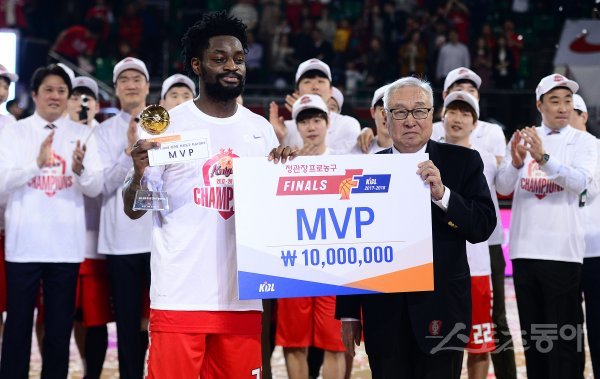 18일 서울 잠실학생체육관에서 열린 ‘2017-2018 정관장 프로농구’ 서울 SK와 원주 DB의 챔피언결정전 6차전 경기에서 SK가 우승을 차지한 뒤 MVP로 선정된 화이트가 김영기 총재와 기념촬영을 하고 있다.