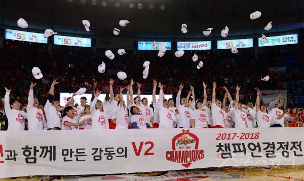 18일 서울 잠실학생체육관에서 열린 ‘2017-2018 정관장 프로농구’ 서울 SK와 원주 DB의 챔피언결정전 6차전 경기에서 SK가 우승을 차지한 뒤 선수들이 모자를 벗어 환호하고 있다.