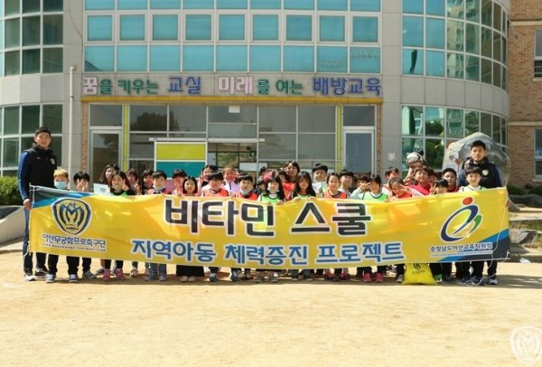 프로축구 K리그2 아산무궁화 프로축구단(대표이사:박성관) 구대영, 최봉진이 19일 비타민 스쿨을 위해 배방초등학교를 방문했다. 두 사람의 방문 소식에 30명의 4학년 학생들은 설렘을 감추지 못 했다.