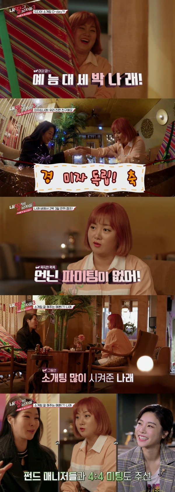 22일 일요일 밤 9시 방송되는 태광그룹 티캐스트 계열 E채널 ‘내 딸의 남자들3’에서 장광 딸 미자는 절친 박나래에게 연애 코칭을 받는다. 또 ‘나래바’에서 2박 3일 동안 숙식하며 술을 먹었던 이야기도 공개할 예정.