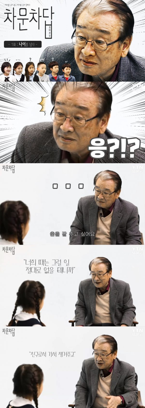 20일 공개된 ‘차이를 넘어 묻고 차이를 넘어 답하다’(이하 ‘차문차답’)에서는 5세, 8세, 10세 등 어린 친구들이 84세 이순재와 결혼부터 친구, 죽음에 이르기까지 다양한 주제를 놓고 가감없이 대화를 나누는 모습을 볼 수 있다.