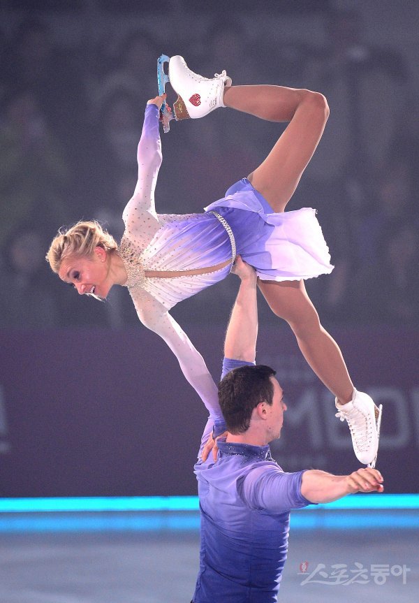 20일 서울시 목동아이스링크에서 열린 ‘인공지능 LG ThinQ 아이스판타지아 2018’ 아이스쇼에서 페어부문 알리오나 사브첸코와 브로노 마소트(독일)가 연기를 펼치고 있다.