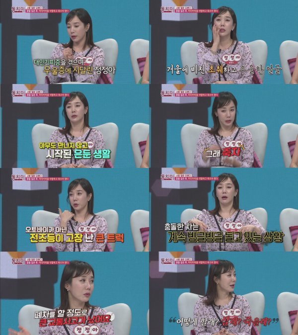 정정아는 “저 멀리서 오토바이가 오더라. 그래서 피했는데, 알고 보니 전조등이 한 쪽 고장 난 트럭이었다. 차가 폐차 될 정도로 큰 교통사고였다. 순간 기절을 했다가, 정신이 살짝 나면서 어디선가 찬바람이 휙 불었다. 그때 ‘너 죽고 싶다고 했지? 죽는 게 어떤 건지 느껴봤어? 어떻게 할래, 살래 죽을래?’라는 목소리가 들렸다. 그때 정말 힘든 일이 많아서 죽고 싶다고 생각했는데, 알고 보니 나는 살고 싶었더라. 그래서 ‘살고 싶어요. 저 살고 싶어요’라고 크게 소리쳤다”라고 말하며 폭풍 오열하는 모습을 보였다.