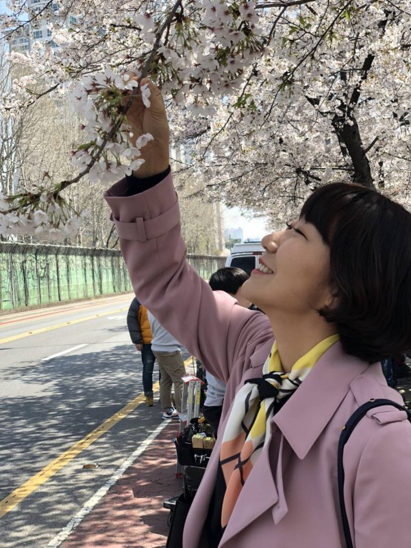 한창 벚꽃이 만개한 시점에 드라마 촬영 중이던 라미란이 잠깐의 쉬는 시간에도 현장을 즐기는 모습이다.