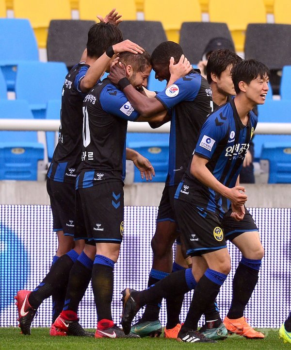 16일 인천축구전용경기장에서 열린 프로축구 ‘2018 KEB 하나은행 K리그1(클래식)’ 강원FC와 인천유나이티드 경기에서 전반전 인천 아길라르(왼쪽)가 선제골을 성공시킨 후 기뻐하고 있다.