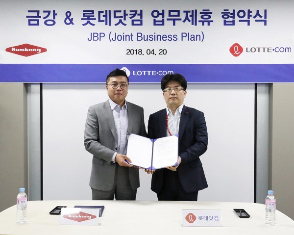 금강제화와 롯데닷컴이 20일 서울 을지로 롯데닷컴 본사에서 업무제휴협약을 체결했다.