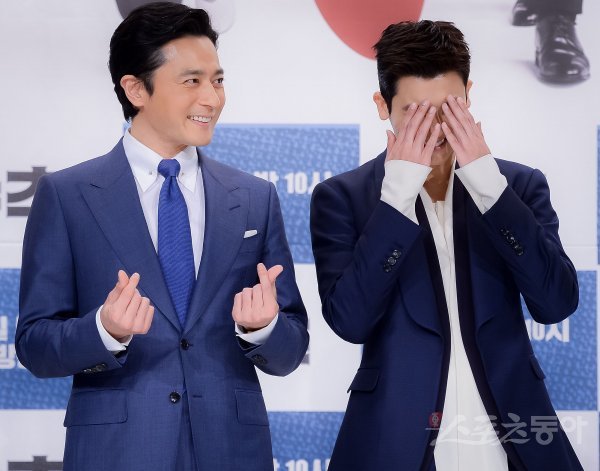 배우 장동건과 박형식(오른쪽)이 23일 서울 영등포 타임스퀘어 내 아모리스 홀에서 열린 KBS2 수목드라마 ‘슈츠’ 제작발표회에서 포즈를 취하고 있다.