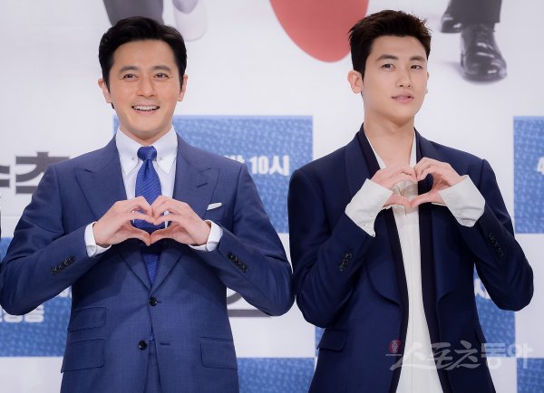 배우 장동건과 박형식(오른쪽)이 23일 서울 영등포 타임스퀘어 내 아모리스 홀에서 열린 KBS2 수목드라마 ‘슈츠’ 제작발표회에서 포즈를 취하고 있다.