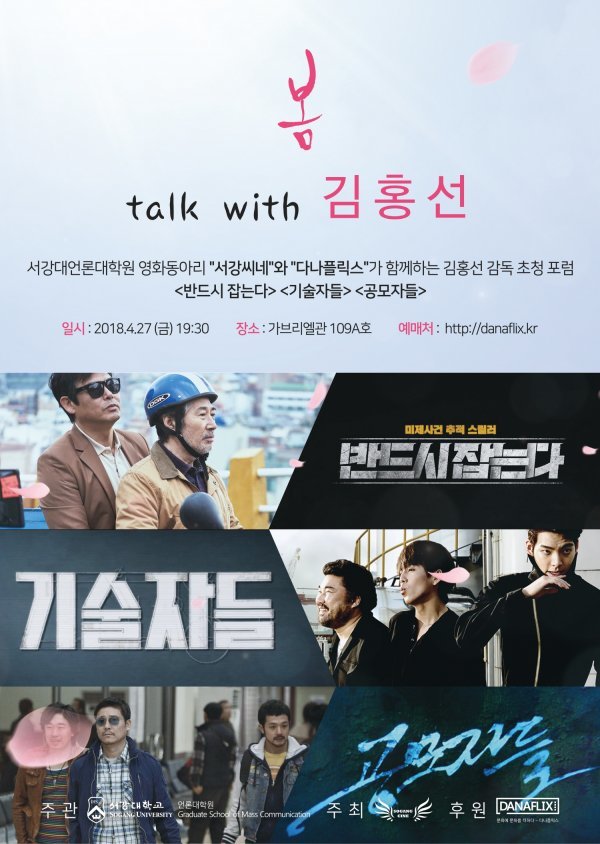 27일 저녁 7시30분부터 서강대학교 가브리엘관 109A호에서 진행될 김홍선 감독의 토크콘서트 ‘봄, Talk with 김홍선’은 서강대학교언론대학원이 주관하고, 서강대학교언론대학원 영화동아리 ‘서강씨네’가 주최했다. 여기에 문화공유플랫폼 다나플릭스가 공식 후원 및 토크콘서트를 준비했다.