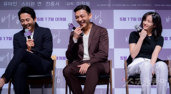 배우 스티븐 연과 유아인, 전종서(왼쪽부터)가 24일 서울 강남구 압구정로에 위치한 CGV 압구정에서 열린 영화 ‘버닝’ 제작보고회에서 미소를 짓고 있다.