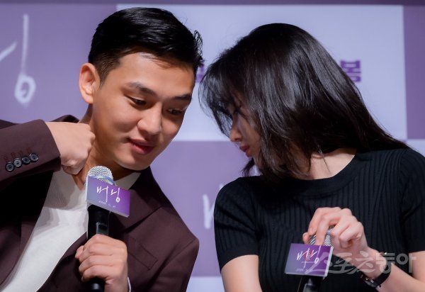 배우 유아인과 전종서(오른쪽)가 24일 서울 강남구 압구정로에 위치한 CGV 압구정에서 열린 영화 ‘버닝’ 제작보고회에서 귓속말을 나누고 있다.