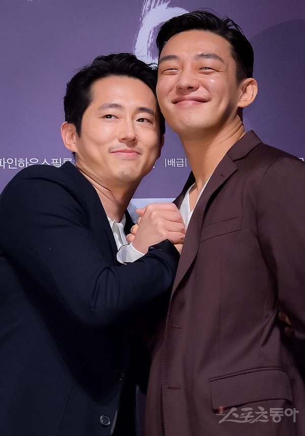 배우 스티븐 연과 유아인(오른쪽)이 24일 서울 강남구 압구정로에 위치한 CGV 압구정에서 열린 영화 ‘버닝’ 제작보고회에서 포즈를 취하고 있다.