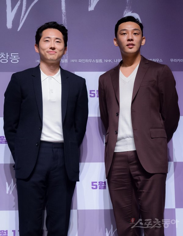 배우 스티븐 연과 유아인(오른쪽)이 24일 서울 강남구 압구정로에 위치한 CGV 압구정에서 열린 영화 ‘버닝’ 제작보고회에서 포즈를 취하고 있다.