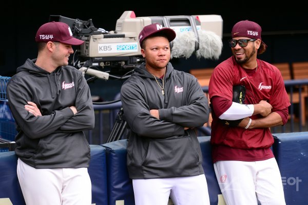 24일 서울 잠실야구장에서 ‘2018 신한은행 MY CAR KBO리그’ 넥센히어로즈와 LG트윈스 경기가 열린다. 경기 전 넥센 브리검, 초이스, 로저스가 이야기를 나누고 있다.