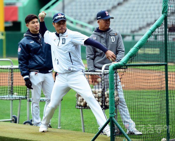 24일 인천 SK행복드림구장에서 ‘2018 신한은행 마이카 KBO리그’ SK 와이번스와 두산 베어스의 경기가 열린다. 경기 전 두산 조성환 코치가 배팅볼을 던지고 있다.
