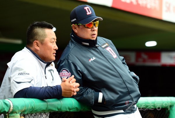 24일 인천 SK행복드림구장에서 ‘2018 신한은행 마이카 KBO리그’ SK 와이번스와 두산 베어스의 경기가 열린다. 경기 전 두산 조인성 코치와 김태형 감독이 이야기를 나누고 있다.