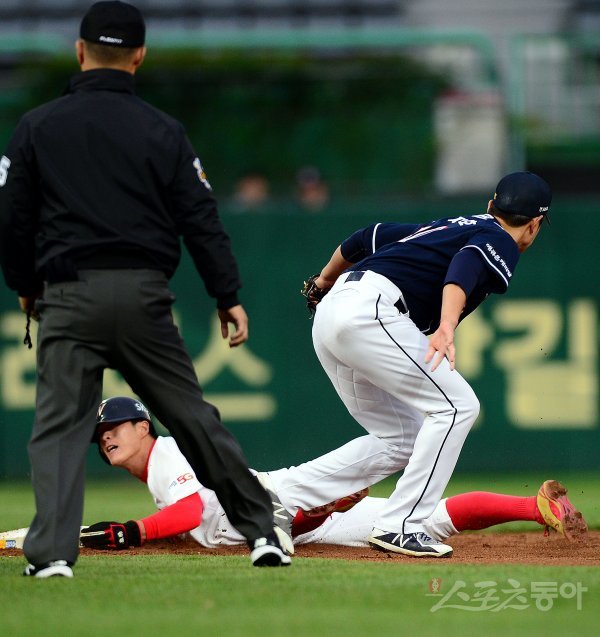 24일 인천 SK행복드림구장에서 ‘2018 신한은행 마이카 KBO리그’ SK 와이번스와 두산 베어스의 경기가 열렸다. 1회말 무사 1루에서 SK 한동민 타석 때 1루 주자 노수광이 2루 도루에 성공하고 있다.